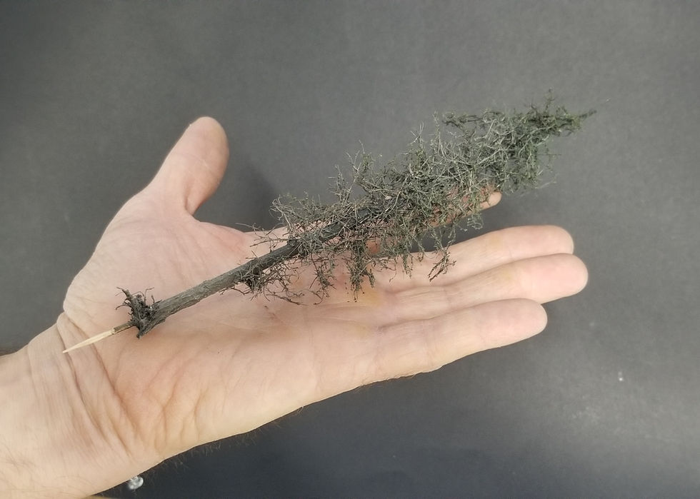 Bring on the green foliage! Modelers have successfully used asparagus fern, Caspia, and furnace filter. However, in my quest to make this easier, yet still offer appreciable results, I developed Green Branches Foliage Material - a specific combination of layered, matted plant fibers and finely processed, dried-&-dyed cedar sawdust, held fast with PVA (aka “white glue”). This material is soft enough to be easily pulled apart and positioned on the trunk, yet stiff enough to maintain the imparted shapes added to it. Still handmade to this day in “sheets”, Green Branches Foliage is like no other in the model scenery industry. And as a consequence of using natural materials from real trees, it just turns out that these model trees are about 95% “real tree”!