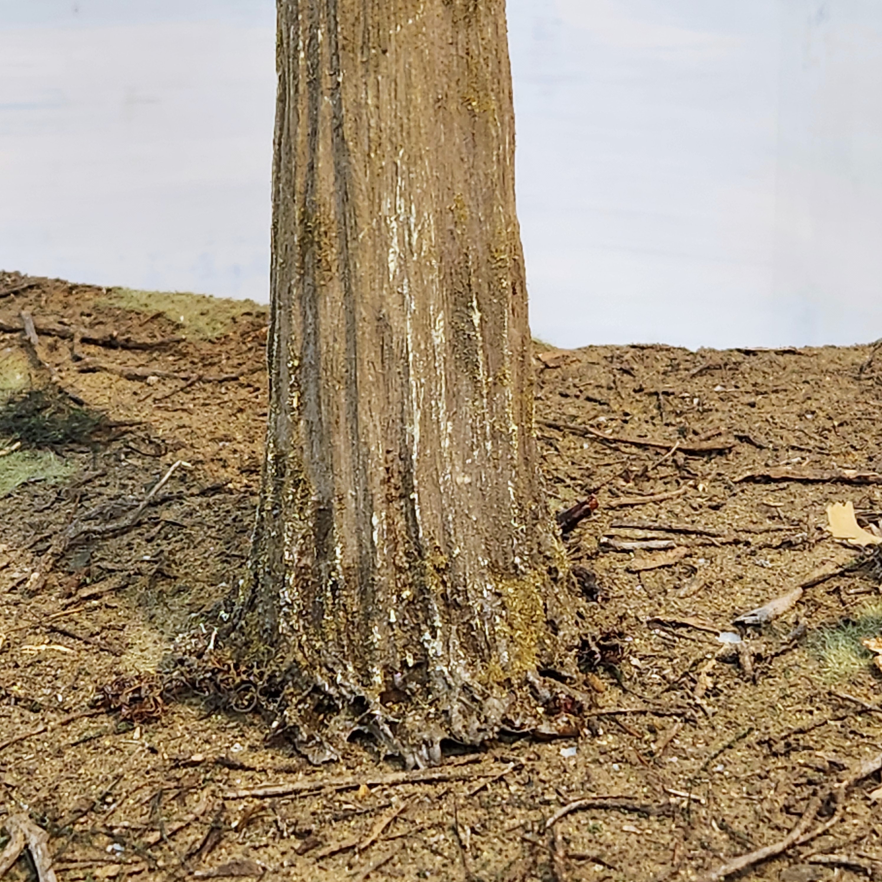 Maximum Detail Fir with a portion of the green foliage placed upon individual limbs. Maximum Detail means that I construct most of the tree as a snag and then follow with the addition of the foliage. Hence it is constructed like a living tree. Many hanging dead branches, plus all the other details including mosses, and lichens, roots. Exclusive Green Branches Foliage, Custom Made Lathe Milled and Hand-Carved Trunk, with exceptional bark detail and natural color. Per request (you must email me) there are a few options: 1) Dead Top as shown in the photos. 2) Optional layer of forest green coarse polyurethane turf which adds body to the foliage, sometimes good on a tree this size, 3) I can add a "tinge of singe" fire-damage appearance on trunk. Many old growth trees have at least some fire damage. Comes with metal base pin for planting. Each tree is made to order right here in Oregon, USA. It usually takes about two weeks to make one of these.