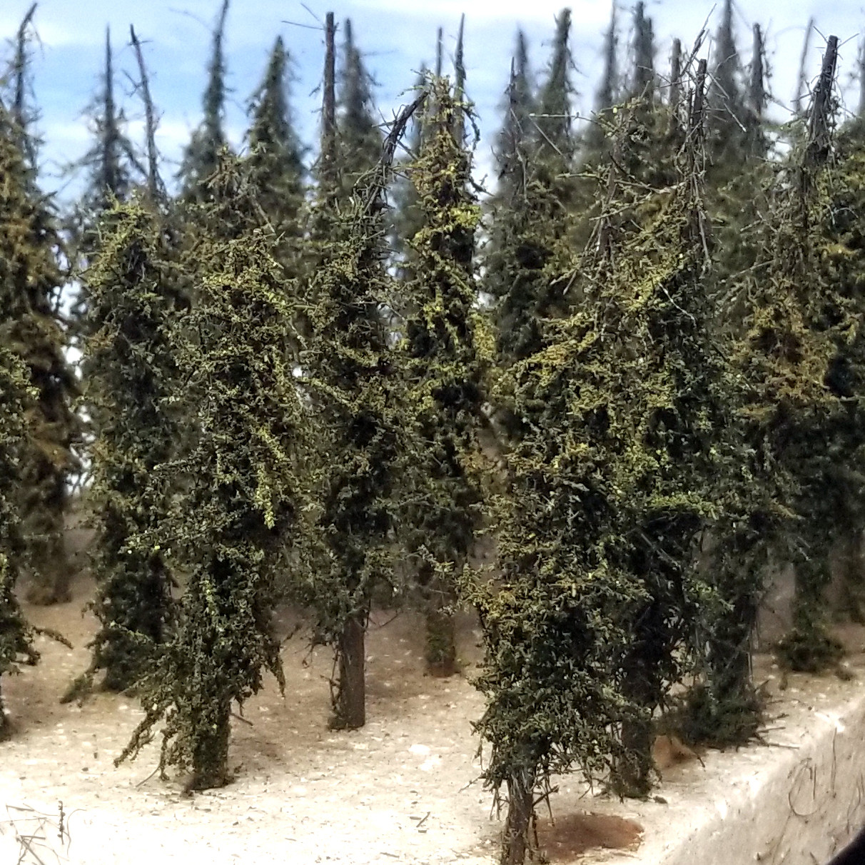 ALPINE Trees, 3-4.5 inches tall, choose EIGHT, 25, or 100 trees, with discounts. Real wood trunks with 3/16 diameters, exclusive armature and green foliage, and coloring highlights. Sharpened dowel ends for planting on layout or diorama. Made in Oregon, USA. Ships in 1-4 days.