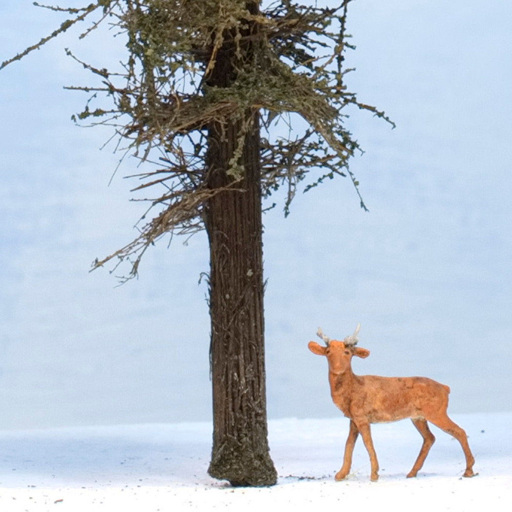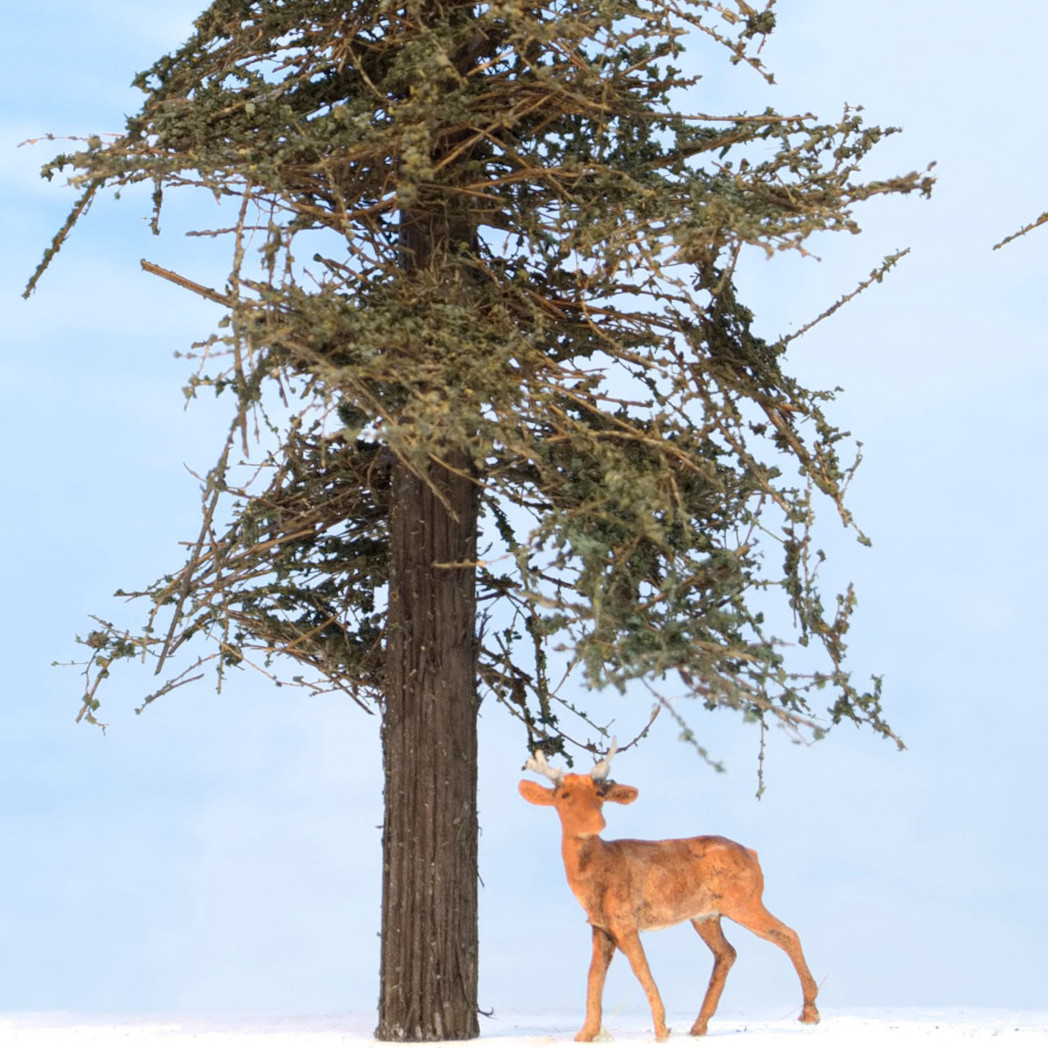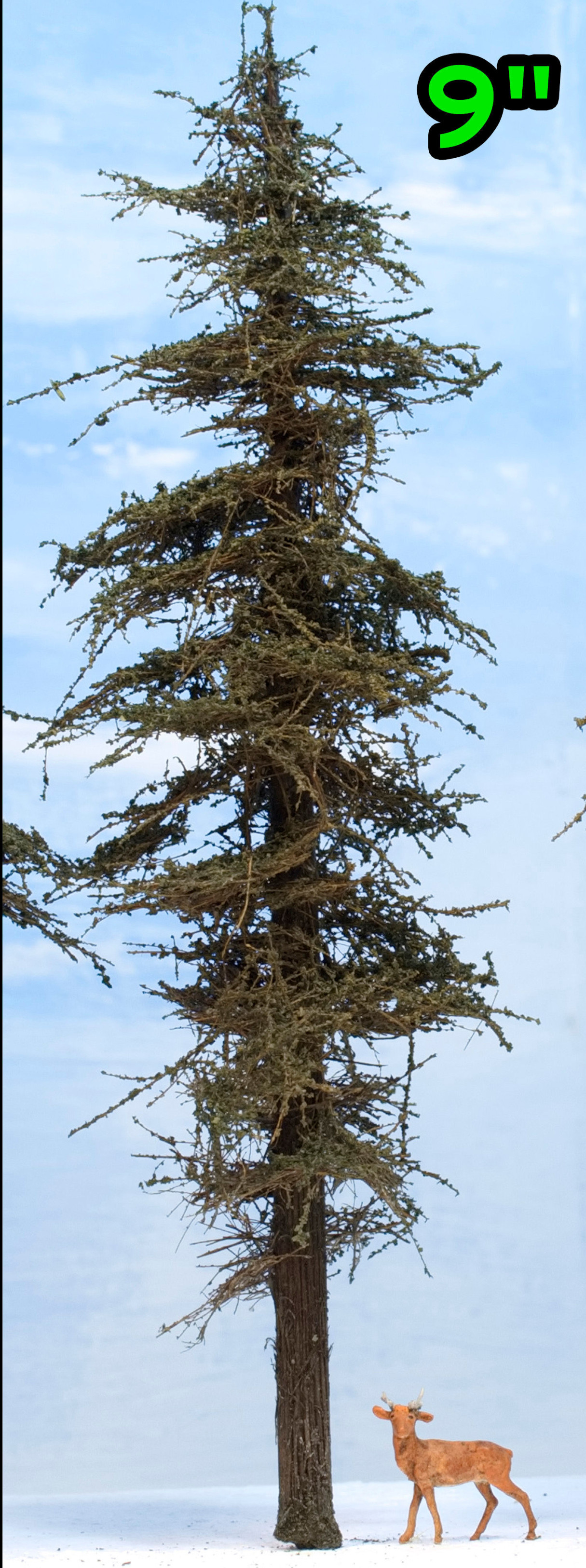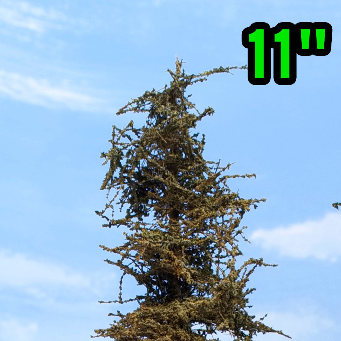 STANDARD Fir Trees - One Each of the 7 Inch, 9 Inch, 11 inch, and 13 inch heights. A total of four trees. Every tree is individually handmade with tapered Port Orford Cedar trunks and our green branches foliage build. Includes foliage highlights, and a light dead-needle effect on the undersides and edges. Trees come with a stainless steel "planting pin" imbedded in the trunk base. Made in Oregon, USA. If not in stock, ships in 1-4 days.
