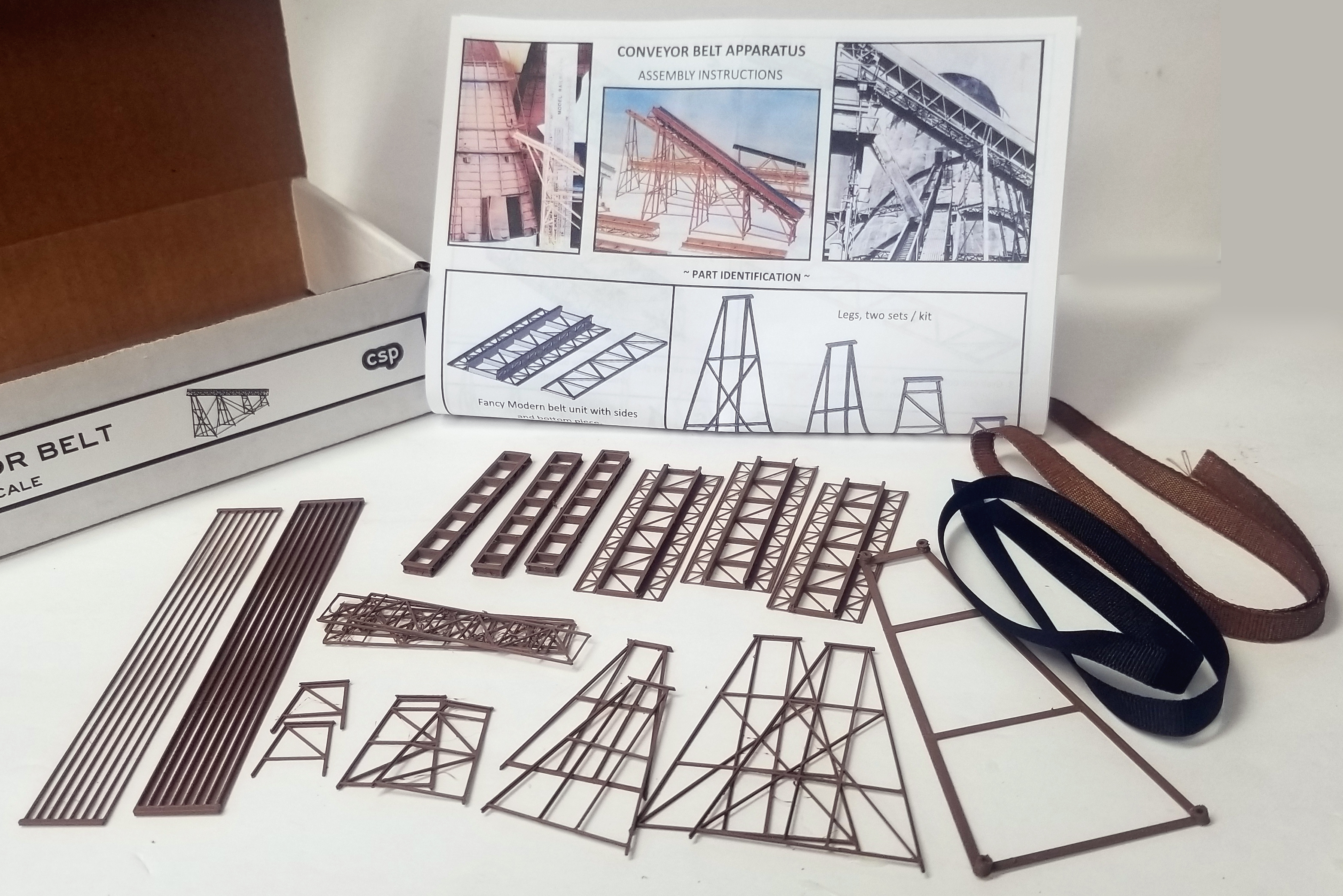 1/87 - HO scale Conveyor Belt Kit. Over 120 scale feet of framework, legs, and belts in the box. Over 32+ advanced 3D printed individual parts, plus some extras just for fun. Complete illustrated instructions included, along with a helpful "Leg Stand" tool that acts as a third hand. Make it with CA, canopy glue, and / or a variable temperature soldering iron. You'll find awesome detail in this critical industrial feature. ...........<em>Keep product in line, and on the move.......</em></strong>