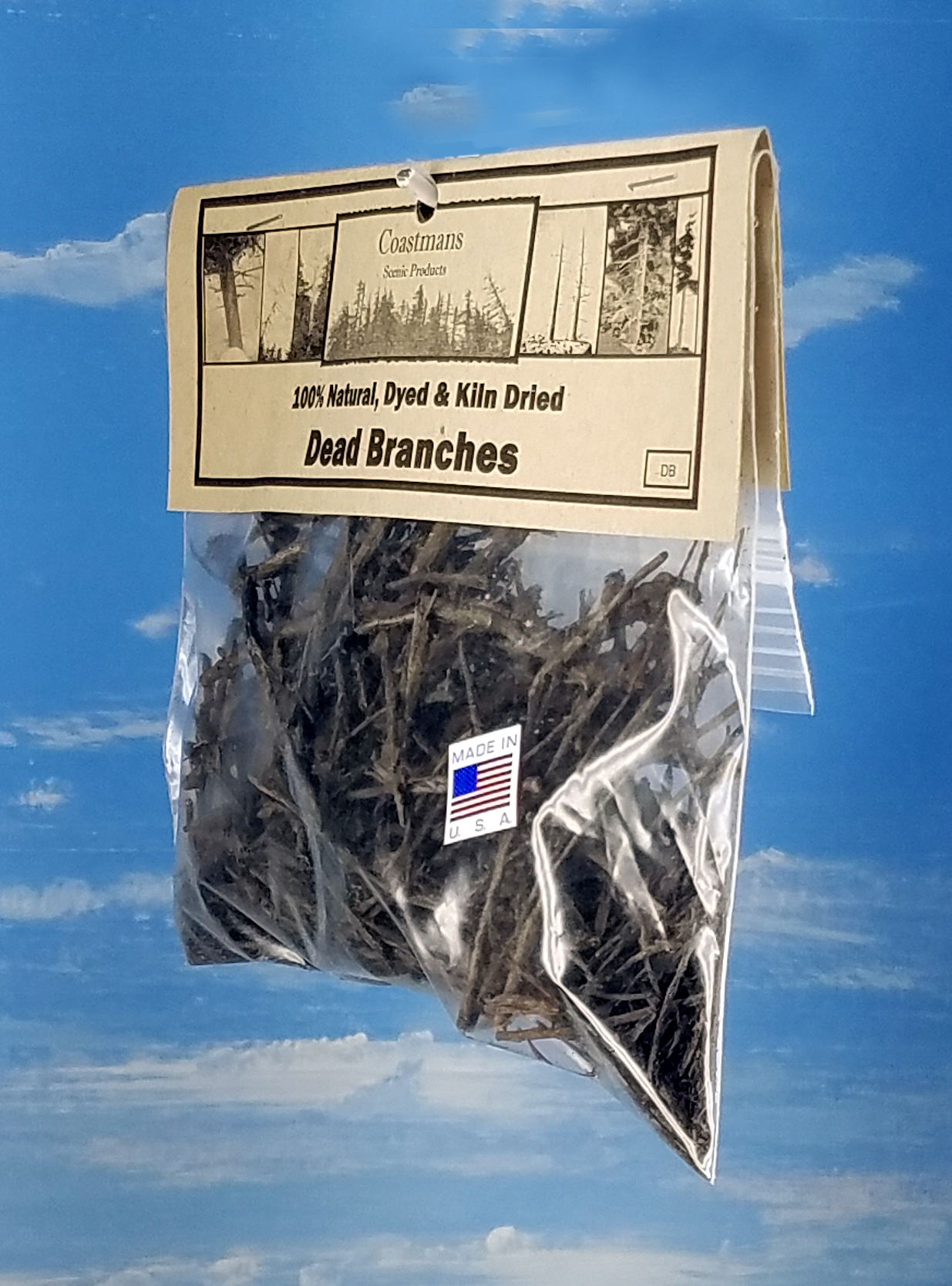 A 1 quart bag filled with high-quality dead branches. Specifically clipped by hand for modeling tree branches, bushes, and forest floor. Ranging 3/4 to 4 inches in length; most are 1 to 2 inches. You can add these to the trees you make, or to any of our trees we make for you. Material is dyed in boiling dye bath and oven-dried at 250F for several hours.