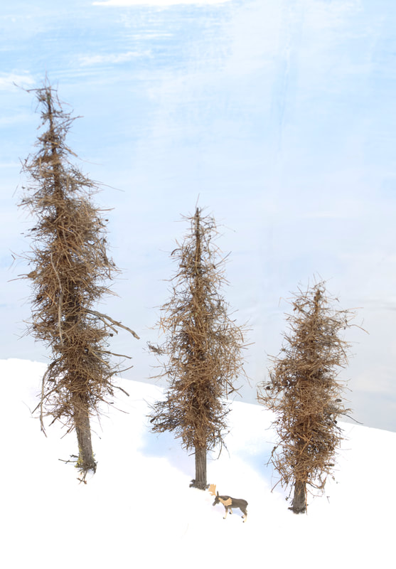 One fire-damaged and/or insect infested seven inch tall tree! Includes a few dead branches and mild rooty detail. Every hillside needs at least one! 7-inch tree is the shortest one on the right in photos. Ships in 1 to 3 days.