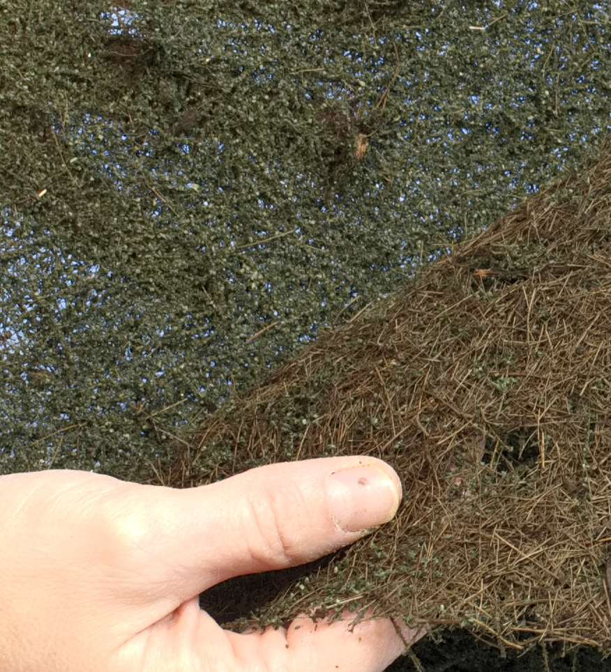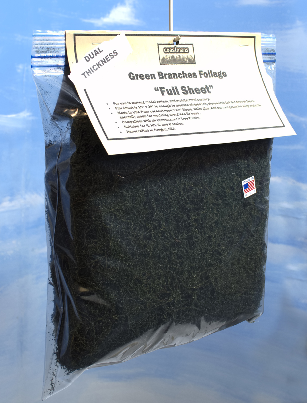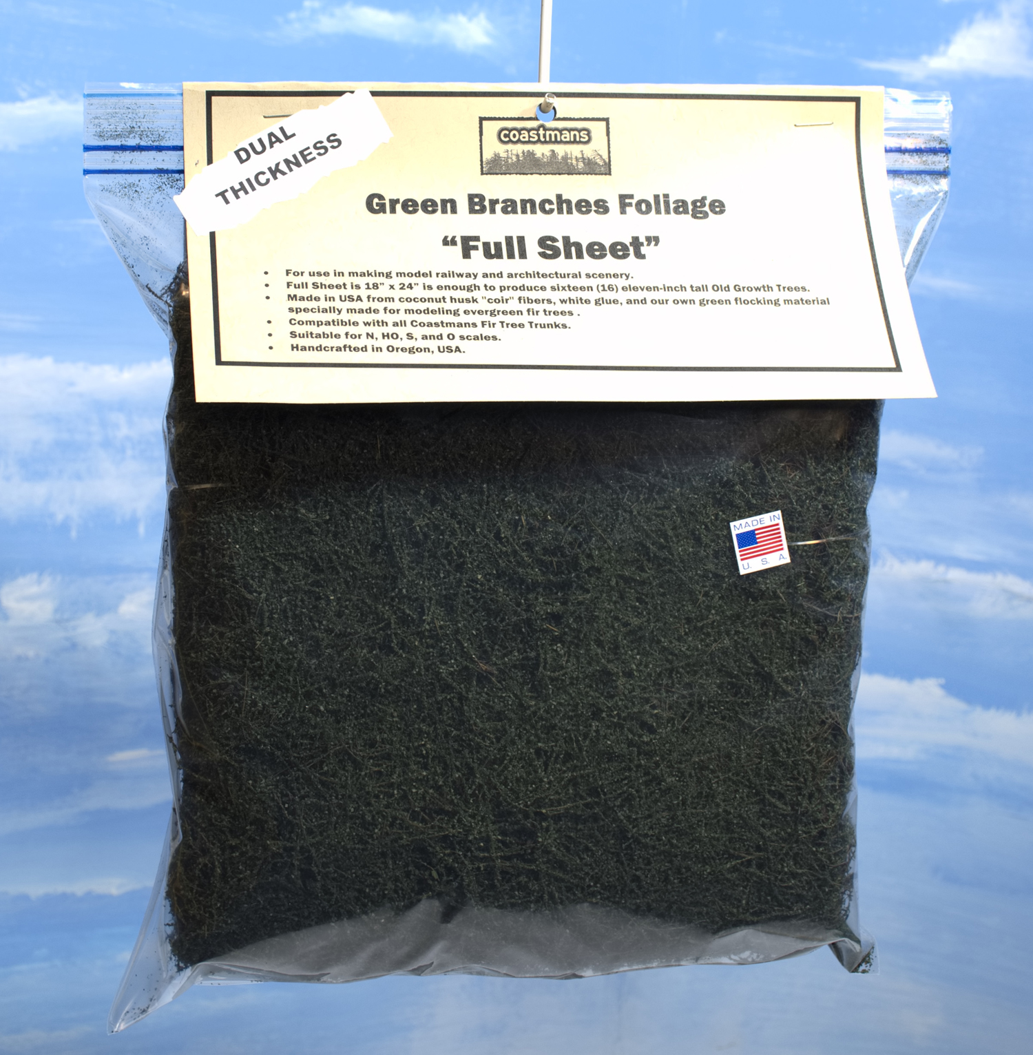 Green Branches foliage, Two-Layers (splitable), FULL SHEET: 15.5" x 23.5". This double-thickness sheet will almost completely separate into two thinner sheets right down the middle. Makes AT LEAST twelve trees when used with the 11" cedar trunks. Green Branches foliage is made from natural fibers and our very own formulation of Port Orford Cedar and PVA for the green flocking. To use, just tear off a small chunk and apply. Trunks not included. Comes with instructions for making trees with our trunks. Non-toxic. Made in Oregon without solvents or harsh chemicals.