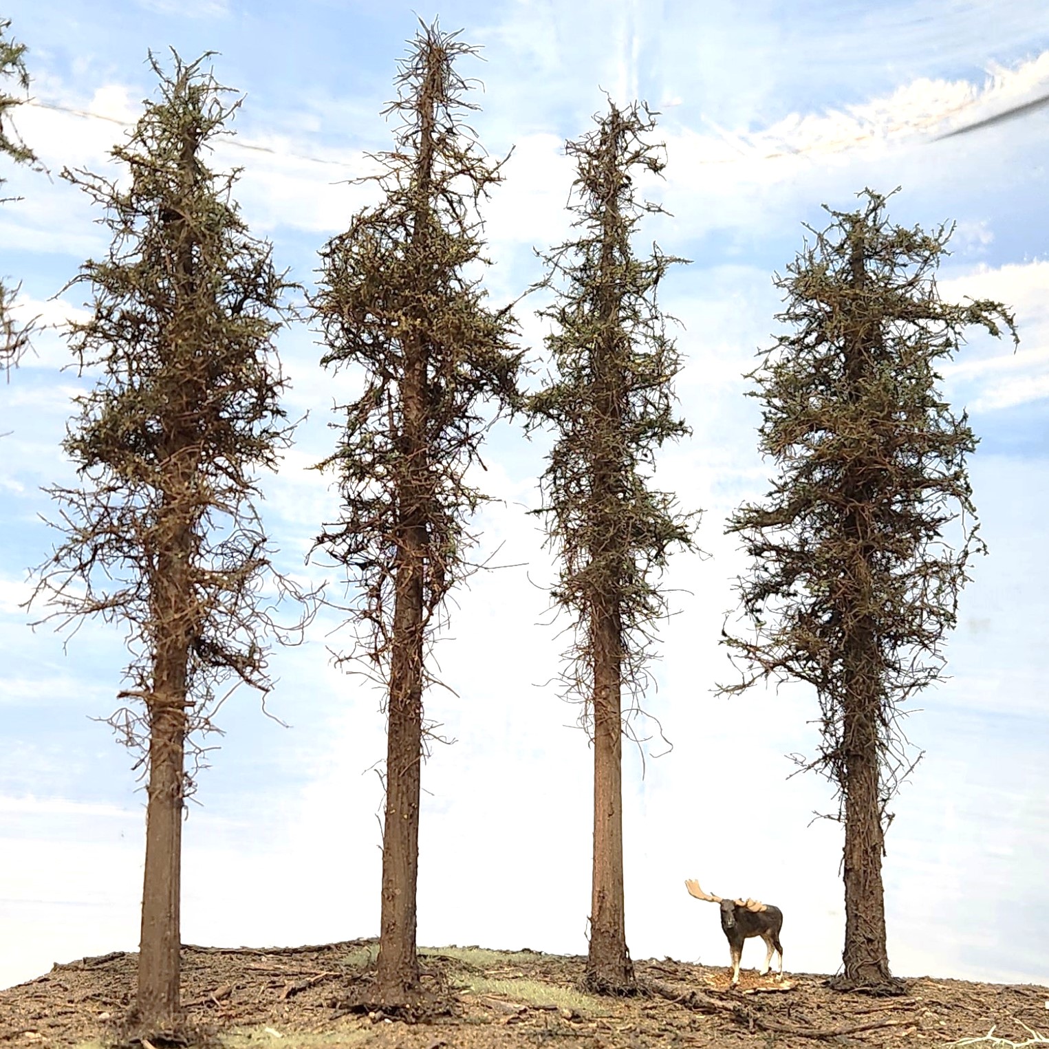 "Lodgepole Style" Pine Trees, 9 inches tall, Four. Made from Port Orford Cedar trunks of 5/16th dowel diameter, and styled with exclusive armature and green foliage, coloring highlights, slight dead needle effect, and root-laden bases. Made with stainless steel planting pins. Made in Oregon, USA. If not in stock, ships in 1-4 days.