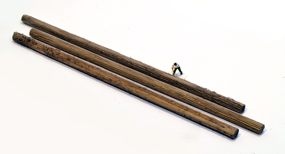 Logs made from white cedar feature bark detail and prototypical color. They have a natural wood color on the inside. 5/16" diameter and 10 inches in length. Included product suggestions and info on how to make your own faller's cuts. One dozen logs.