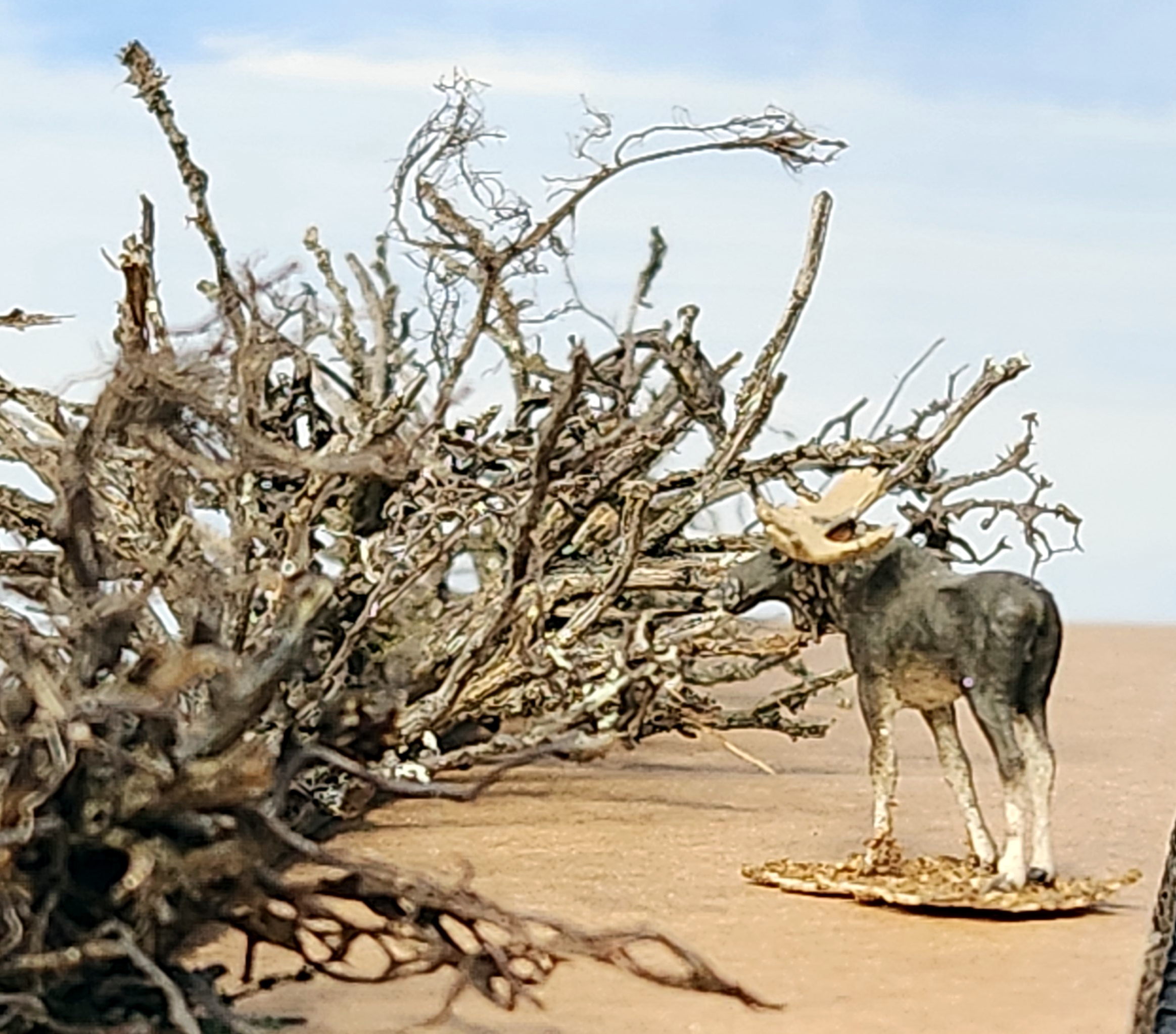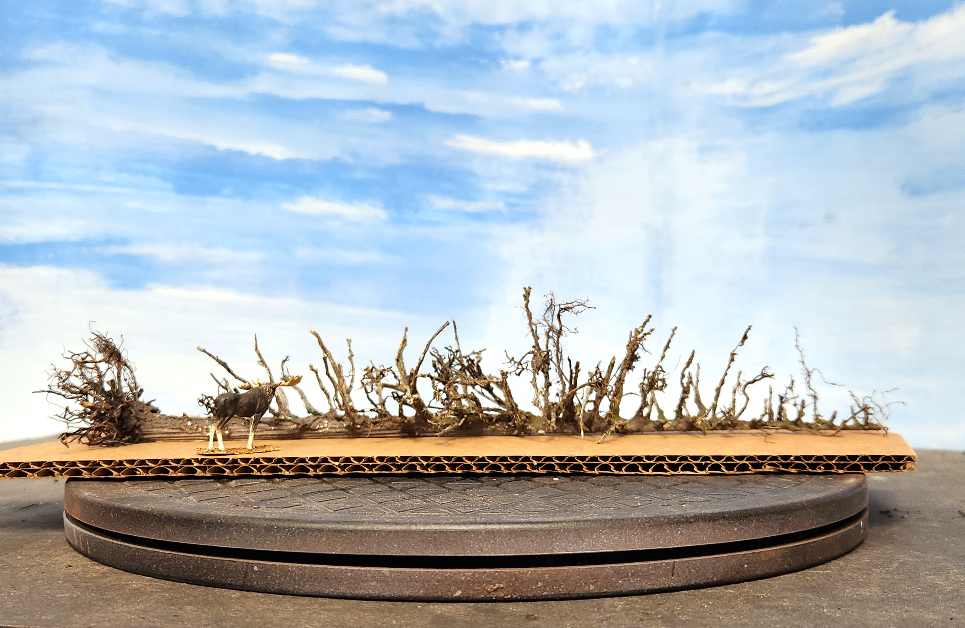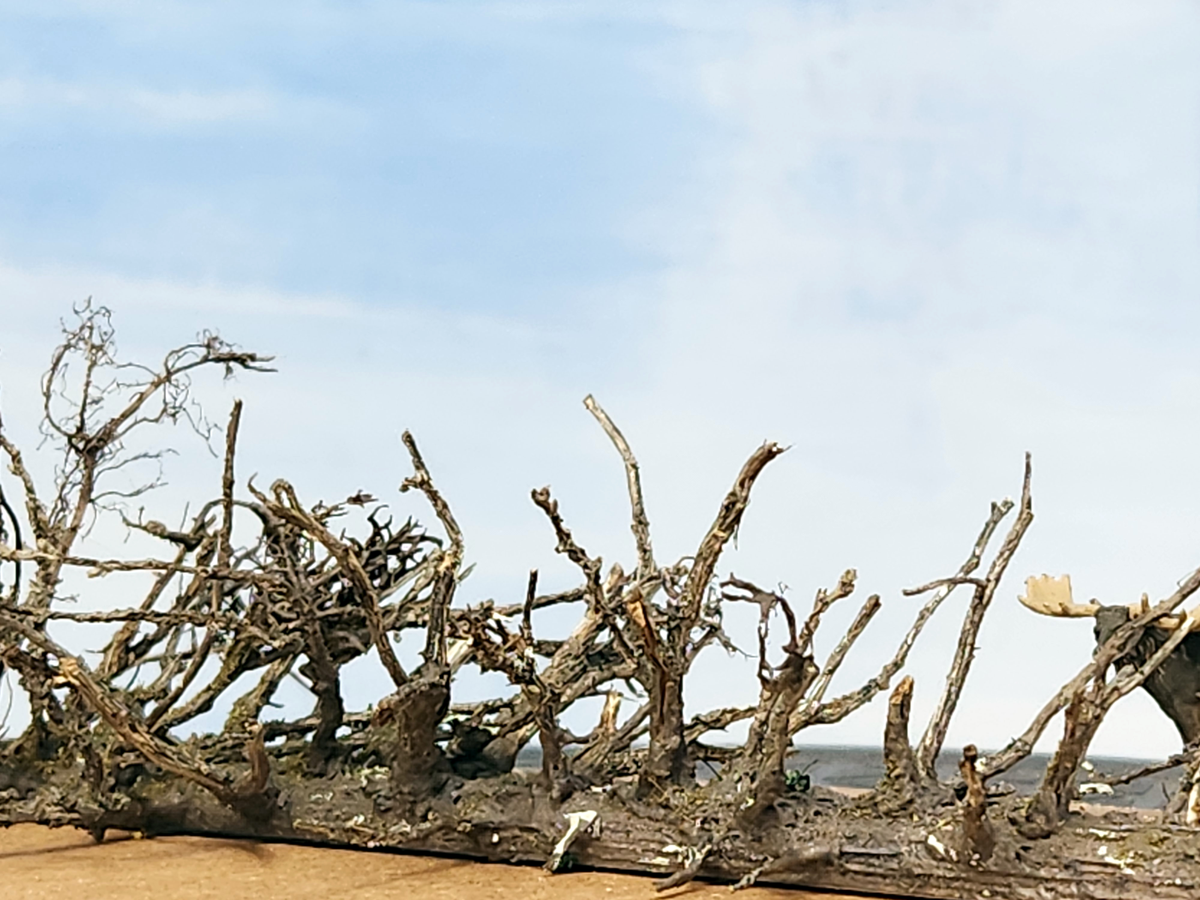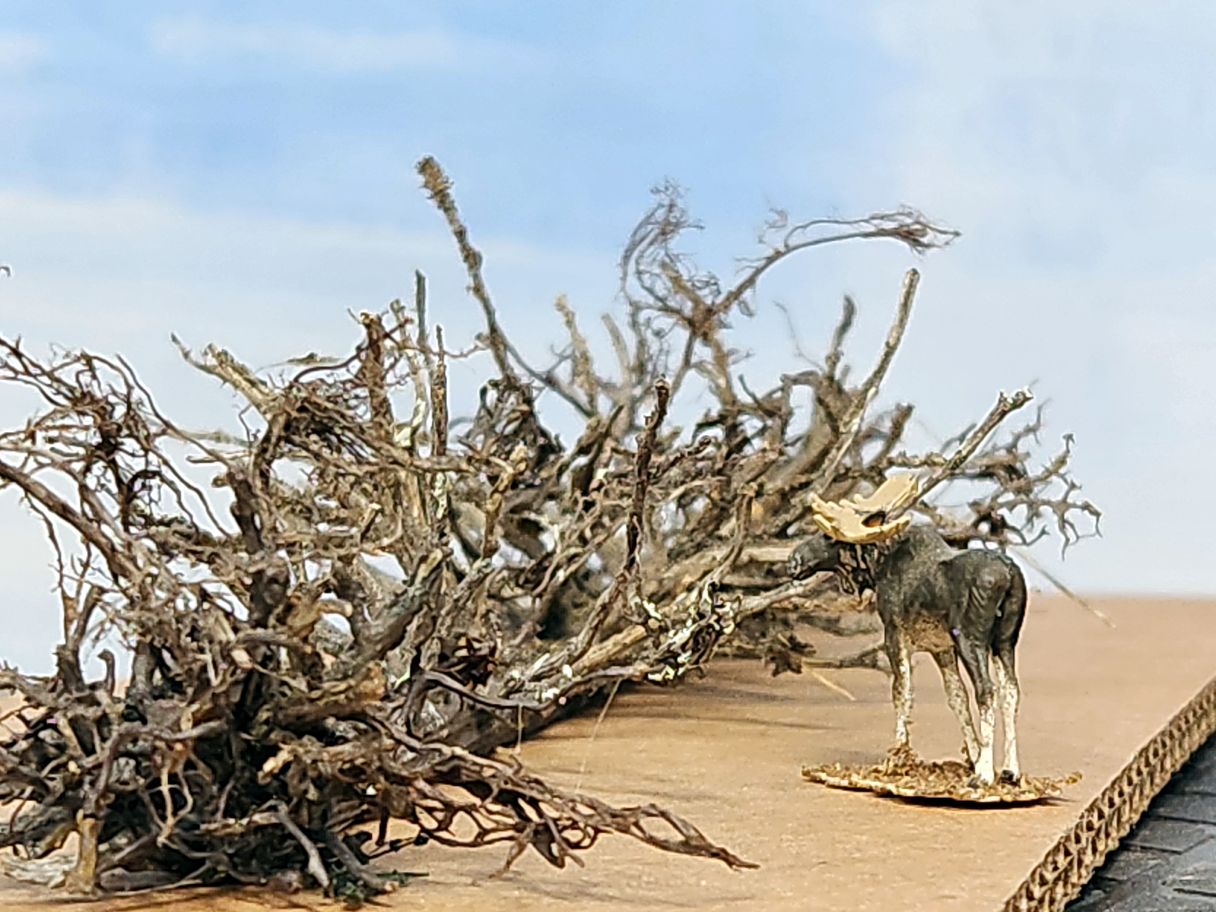 Eleven-inch length lying snag tree. This is essentially a snag tree that is flat on one side and with extra rooty details. Plenty of dead branches, plus roots, moss, and lichen. If not in stock, made to order; 1-3 days required to make. Treemaker reserves some artistic license to be utilized upon each individually handcrafted tree. Diorama not included; is HO scale for reference only.