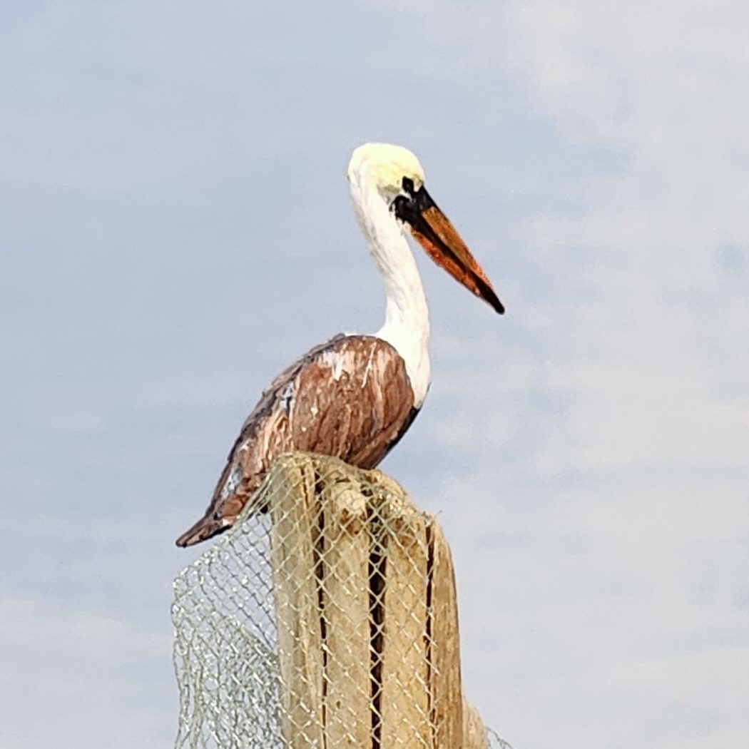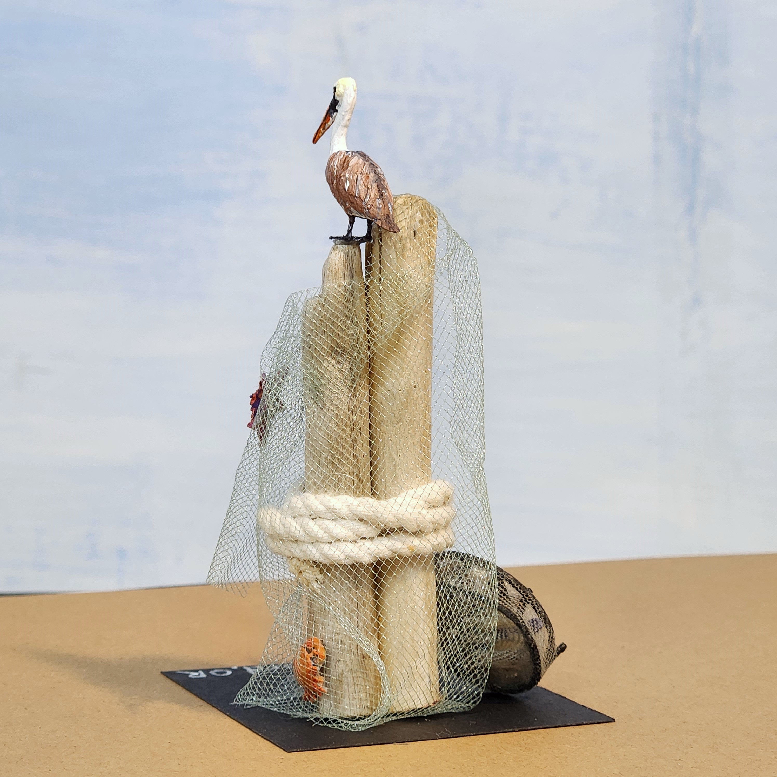A scene from the coast. A pelican perched on pilings, with starfish, a crab, crabpot, buoys, and fishing net.