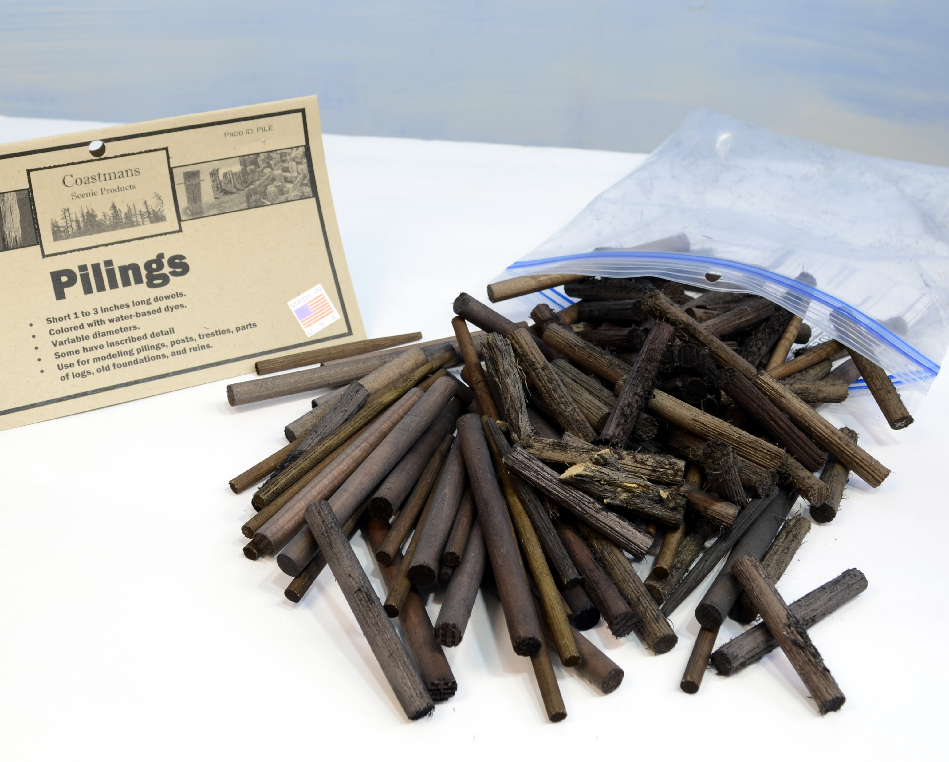 Pilings are short cutoffs ranging 3/4ths inch to 3 inches in length. Most are 1 to 2 inches. These can be either Port Orford Cedar or Bamboo. A few have the "bark detail" that is featured on the tree trunks. Others are smooth. Many diameters 5/16", 3/8, and some are 1/2 and 3/16. These are useful for wharves, pilings, bridges, short logs, lumber loads, and more. They are colored with water based dyes on the exterior only. Inside there is a natural wood color.