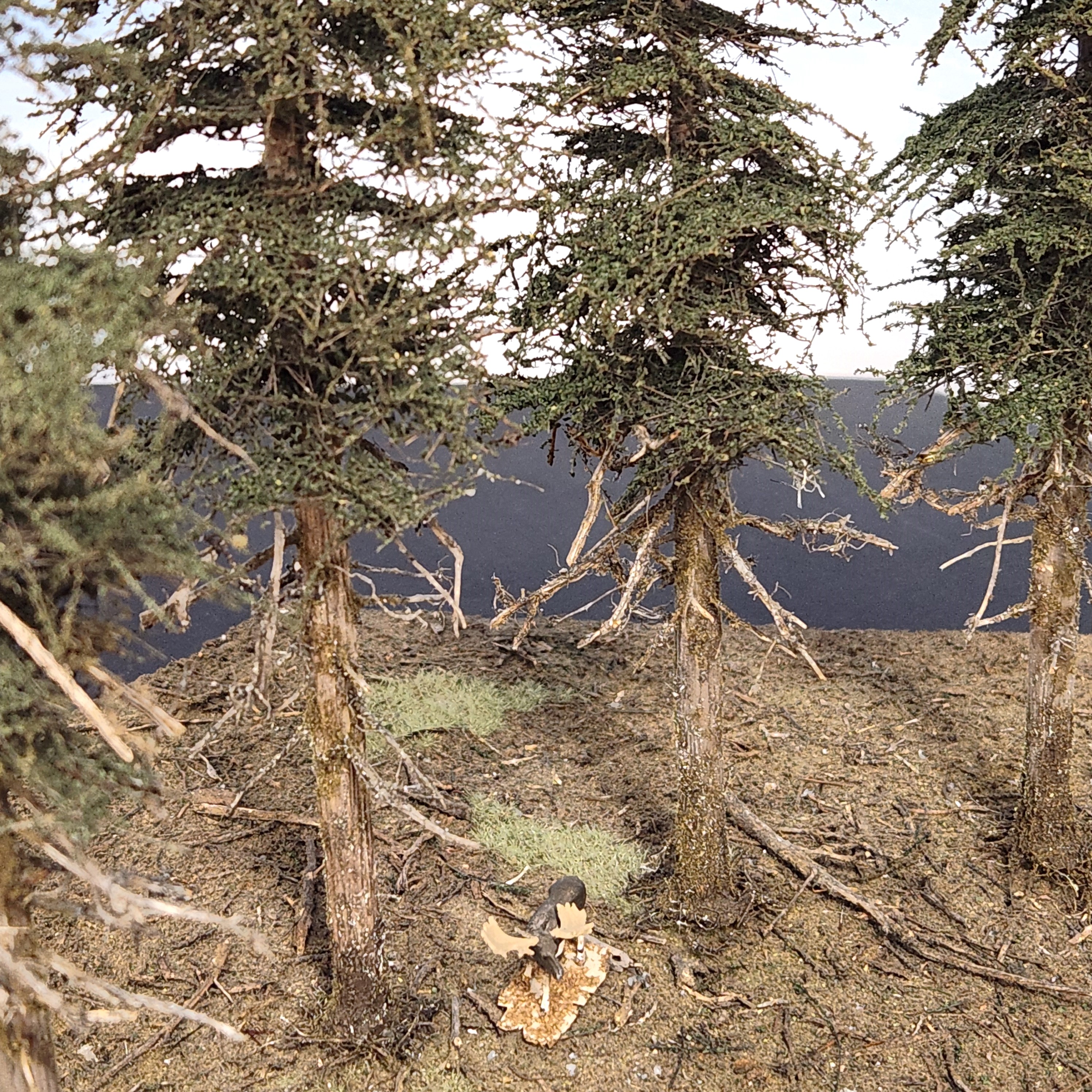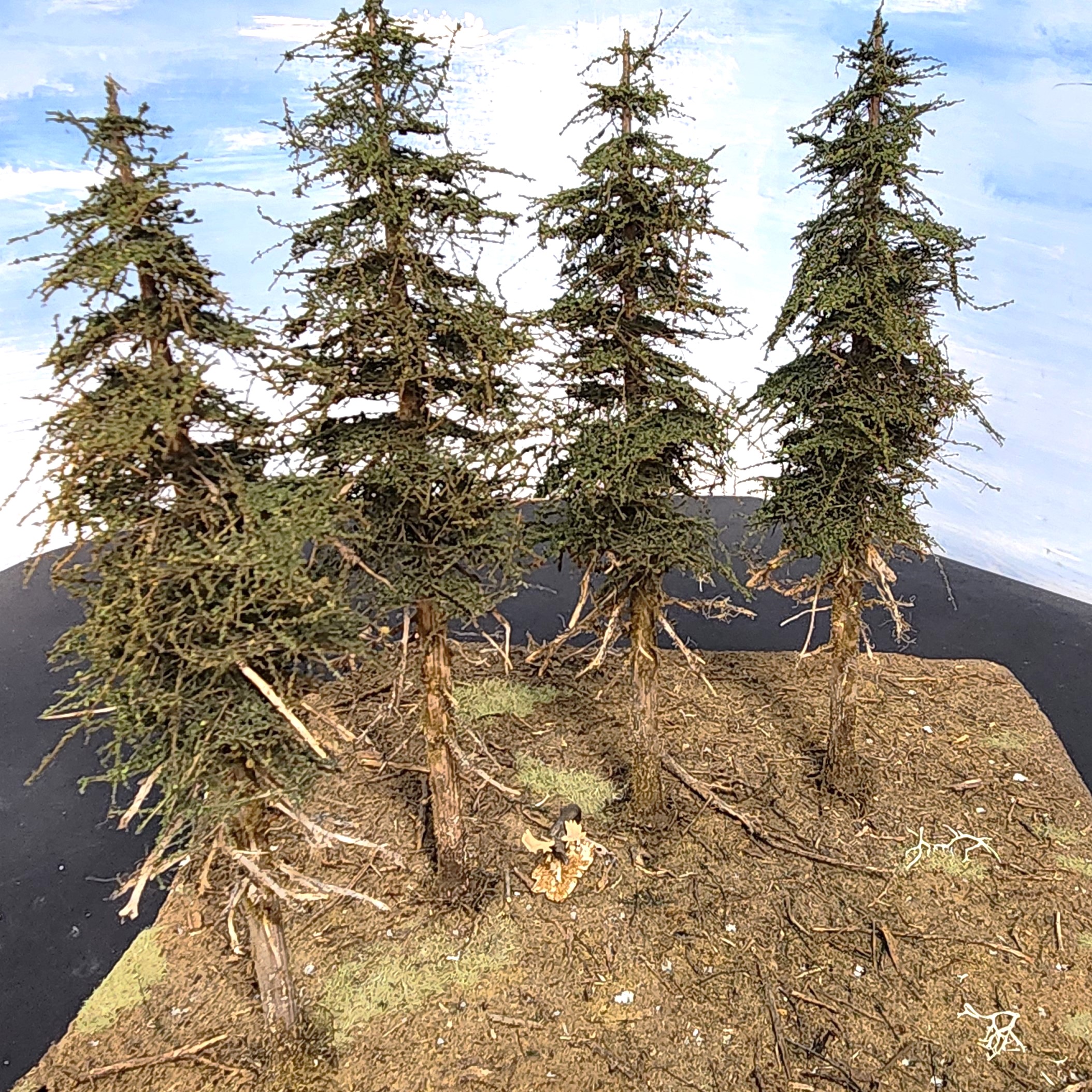 Nine-inch tall Premium Fir Trees with an "Old Growth" appearance. Choose the Quantity. Made with our exclusive tapered Port Orford Cedar wooden trunks and Green Branches Foliage Materials. They have everything the Craftsman trees do, including foliage highlights and the dead needle effect on the underside and tips of the lower branches. Additionally, these trees include a generous application of dead branches, root detail, a sprinkle of two mosses, and a light application of lichen type color on the trunk base. Includes stainless steel planting pin already in the base for direct-to-layout application. If not already in stock, this will be made to order and will ship in 4 to 7 days. (Diorama and Moose are HO scale for size reference and not included.)