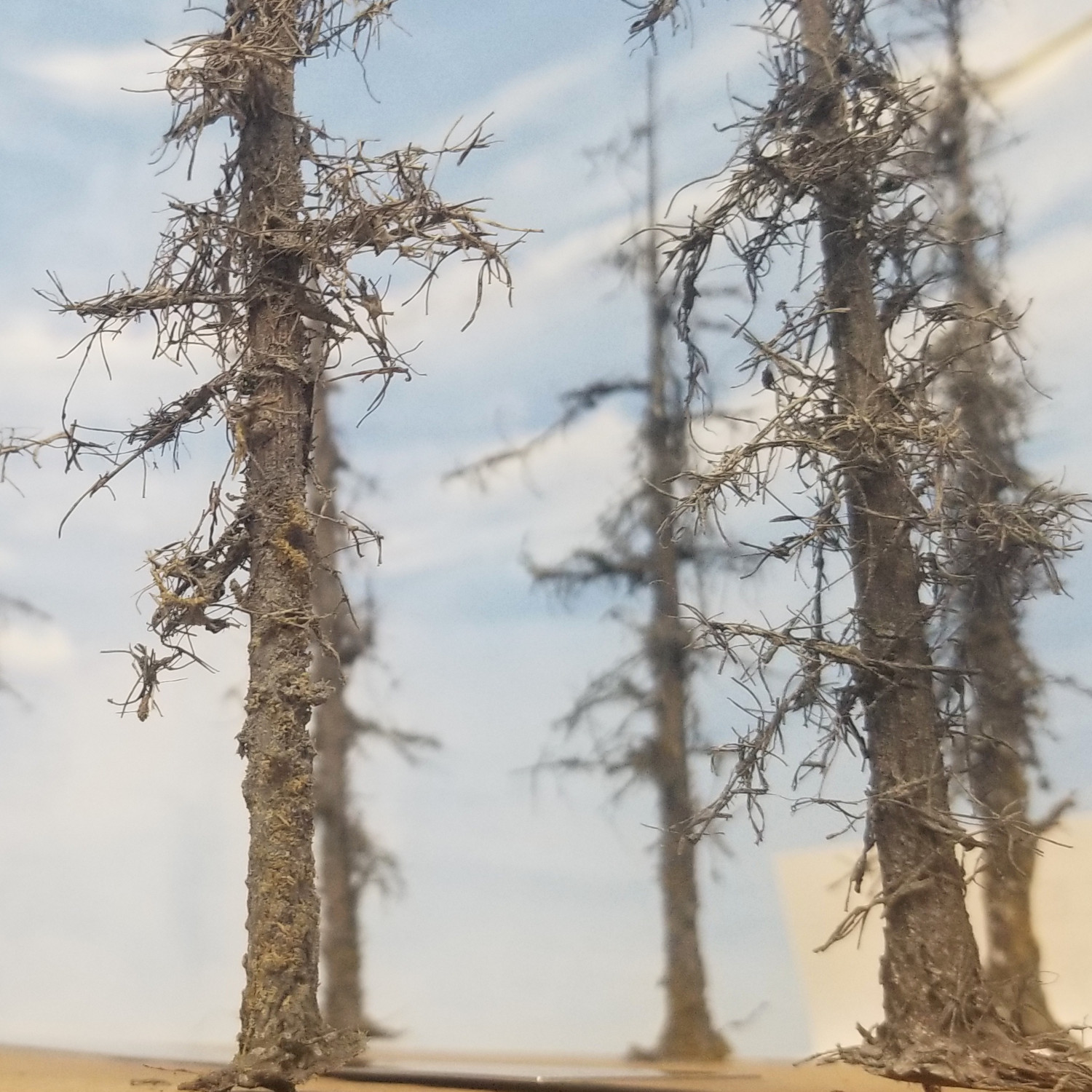 These rough versions of our snags have a different affect than our usual branch-by-branch method. We start with a finely tapered trunk, then add rich dead branch detail using the "additive fibers" method. Then they get a flared trunk with root system, and airbrushed. We add our moss and lichen detailing. Steel planting pins are 3/4" length and already inserted (caution: sharp). These would make for tall and interesting N scale snag trees.