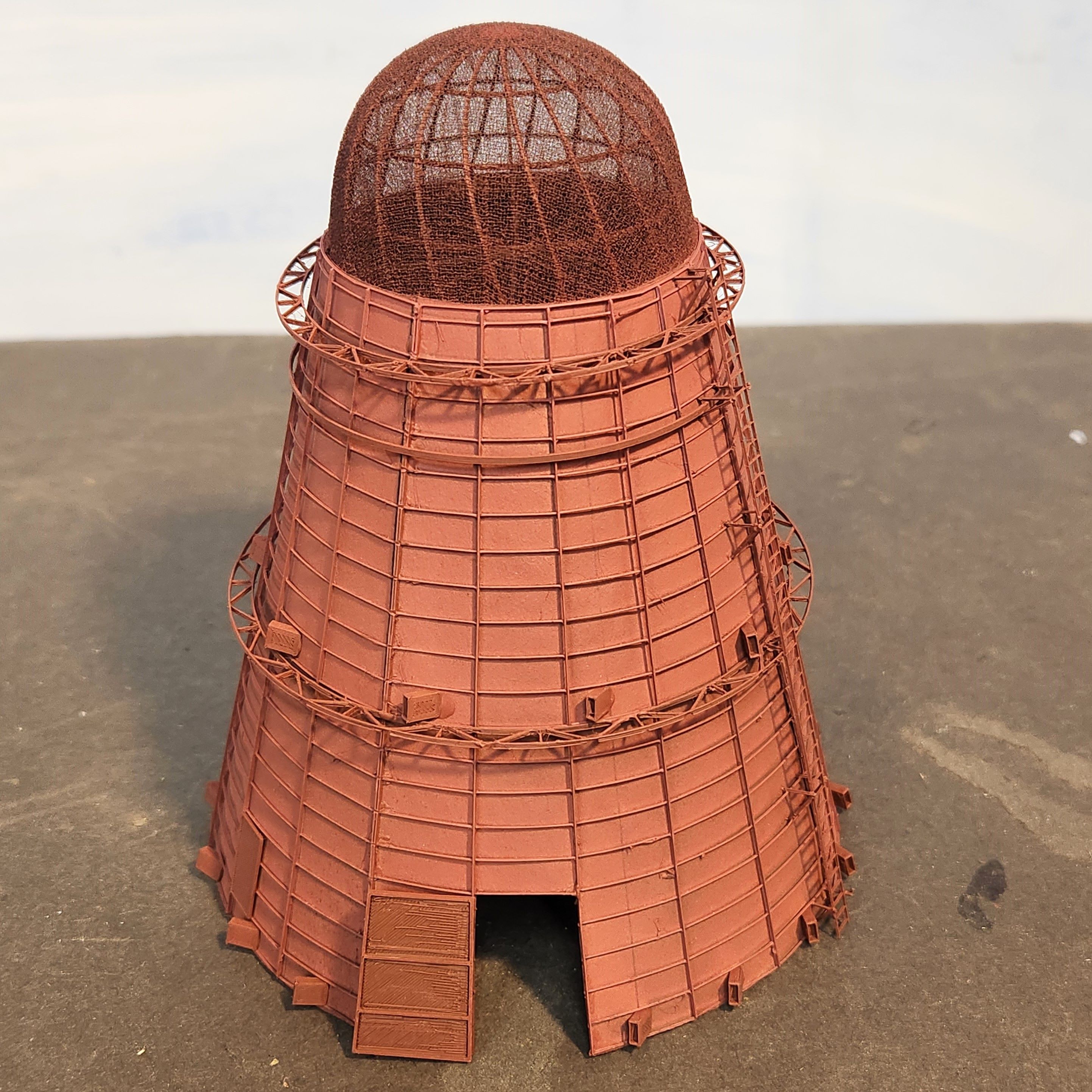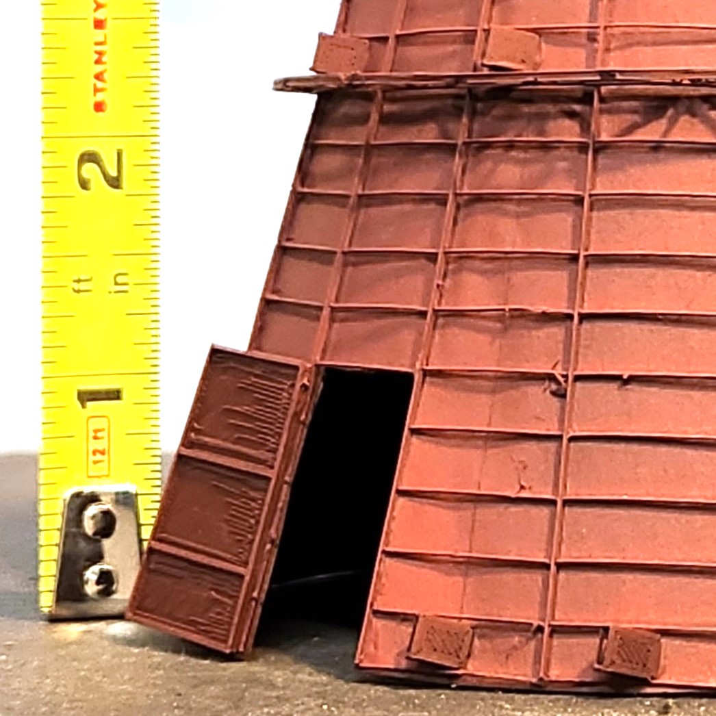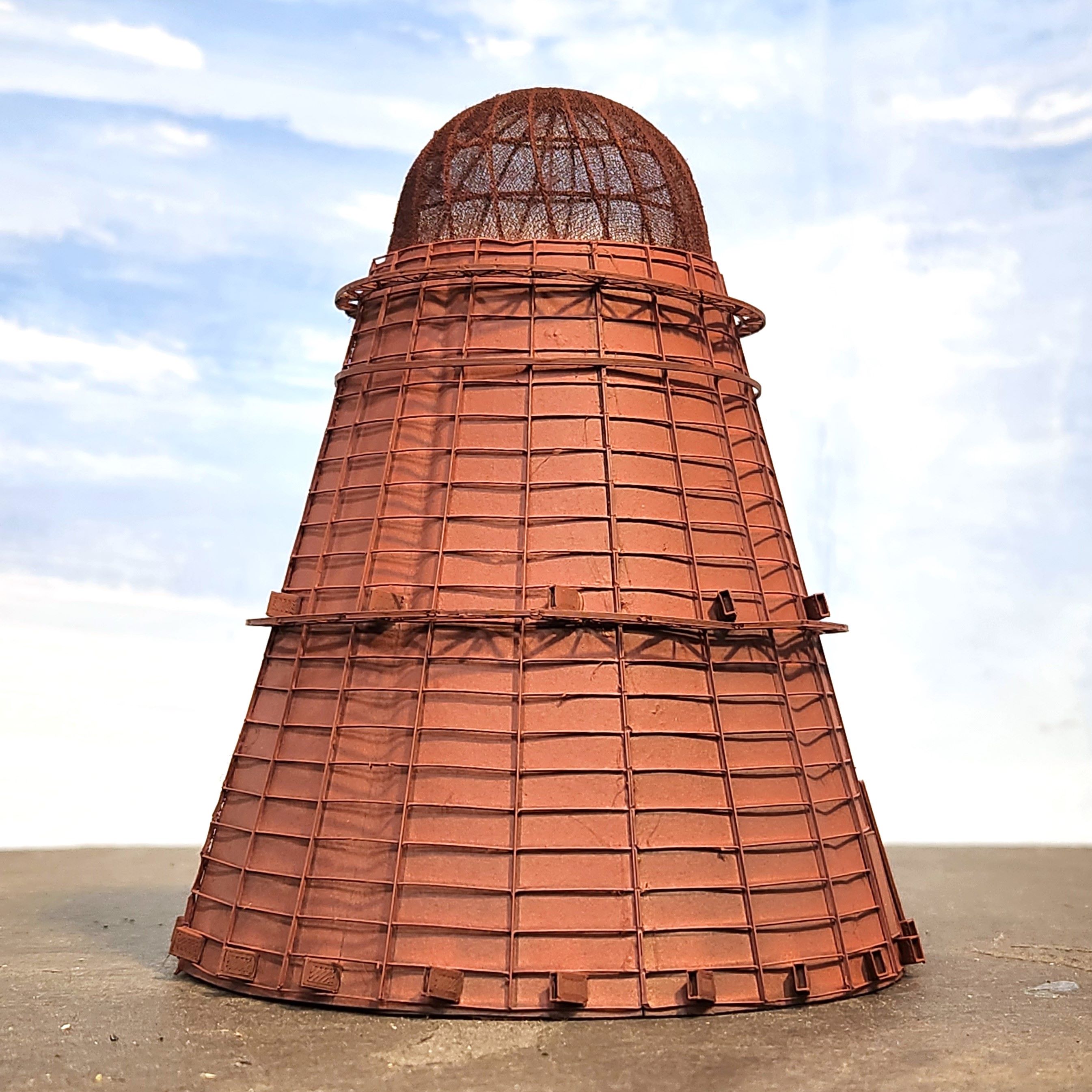 6" tall x 5" diameter. That's 80% of the big model, with all the original details are packed in, with essentially no compromises to the proportions of the parts! Perfect for a mill scene burner in the background. Or up front! This is the newest addition, and we have a 70% version too, with few if any proportional compromises. What you see is what you get: You are ordering the specific model shown. Foundation not included, but the "plain" variety or the somewhat customized "concrete" perimeter foundation are available separately for a nominal charge.