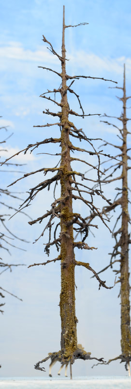 Eleven Inch Tall ReadyMade Snag Tree. Plenty of dead branches, plus roots, mosses, and lichen. If not in stock, made to order; 1-3 days required to make. Vanna the Moose not included (is HO scale for reference only.) Treemaker reserves some artistic license to be utilized upon each individually handcrafted tree. Consider a bird's nest to create a point of interest. Price is for one 11" Snag.