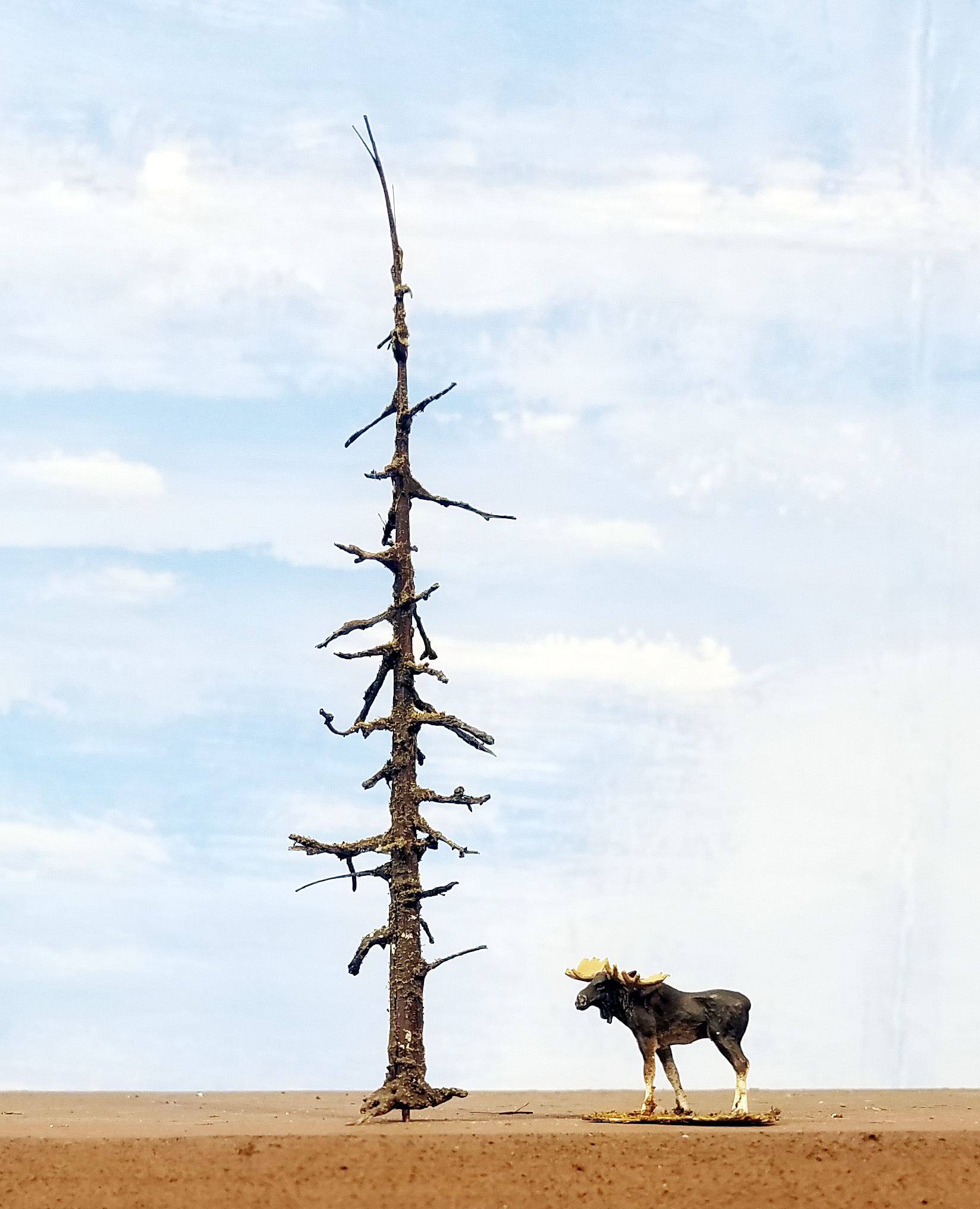 Five Inch Tall Ready-Made Snag Tree. Plenty of dead branches, plus roots, moss, and lichen details. If not in stock, made to order; 1-3 days required to make. Tree-maker reserves some artistic license to be utilized upon each individually handcrafted tree. Vanna the Moose and layout not included; they are HO 1/87 for scale reference.