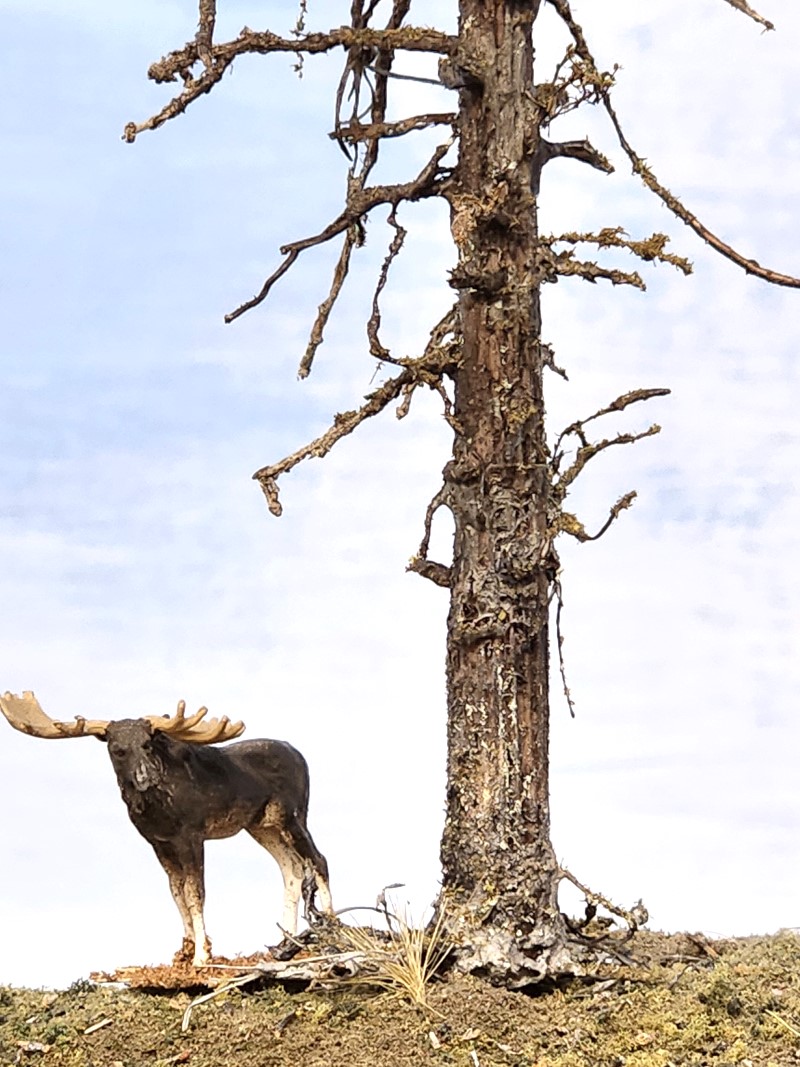 Seven Inch Tall ReadyMade Snag Tree. Plenty of dead branches, plus roots, moss, and lichen. If not in stock, made to order; 1-3 days required to make. Treemaker reserves some artistic license to be utilized upon each individually handcrafted tree. Consider a bird's nest to create a point of interest. Vanna the Moose not included; is HO scale for reference only.