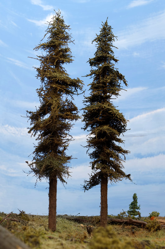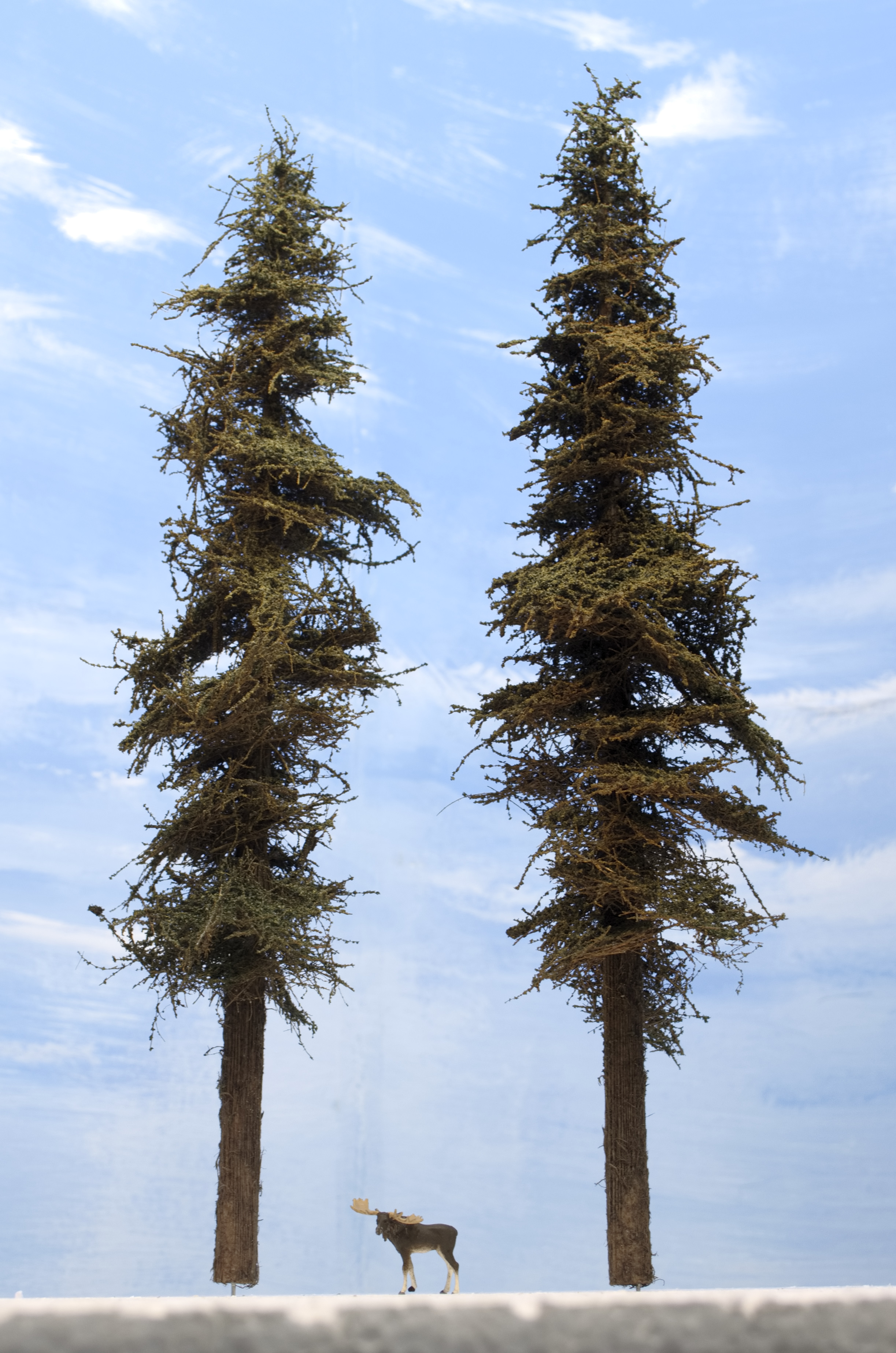 STANDARD Firs 13 Inch height ReadyMade Fir Trees, TWO per box. Every tree is individually handmade with tapered Port Orford Cedar trunks and our green branches foliage build. Includes foliage highlights, and a light dead-needle effect on the undersides and edges. Comes with stainless steel "planting pin" imbedded in the trunk base. Made in Oregon, USA. If not in stock, ships in 1-4 days.