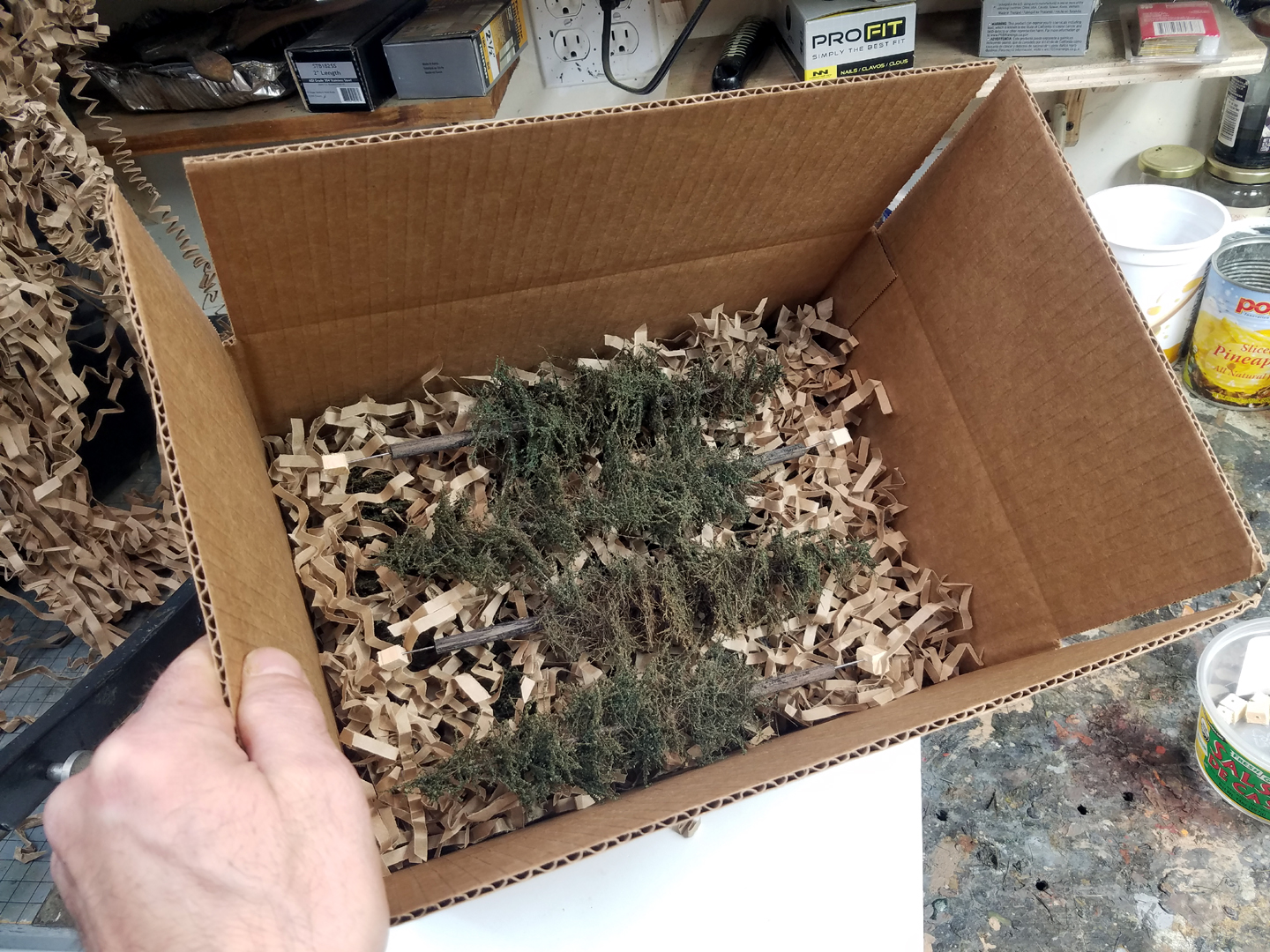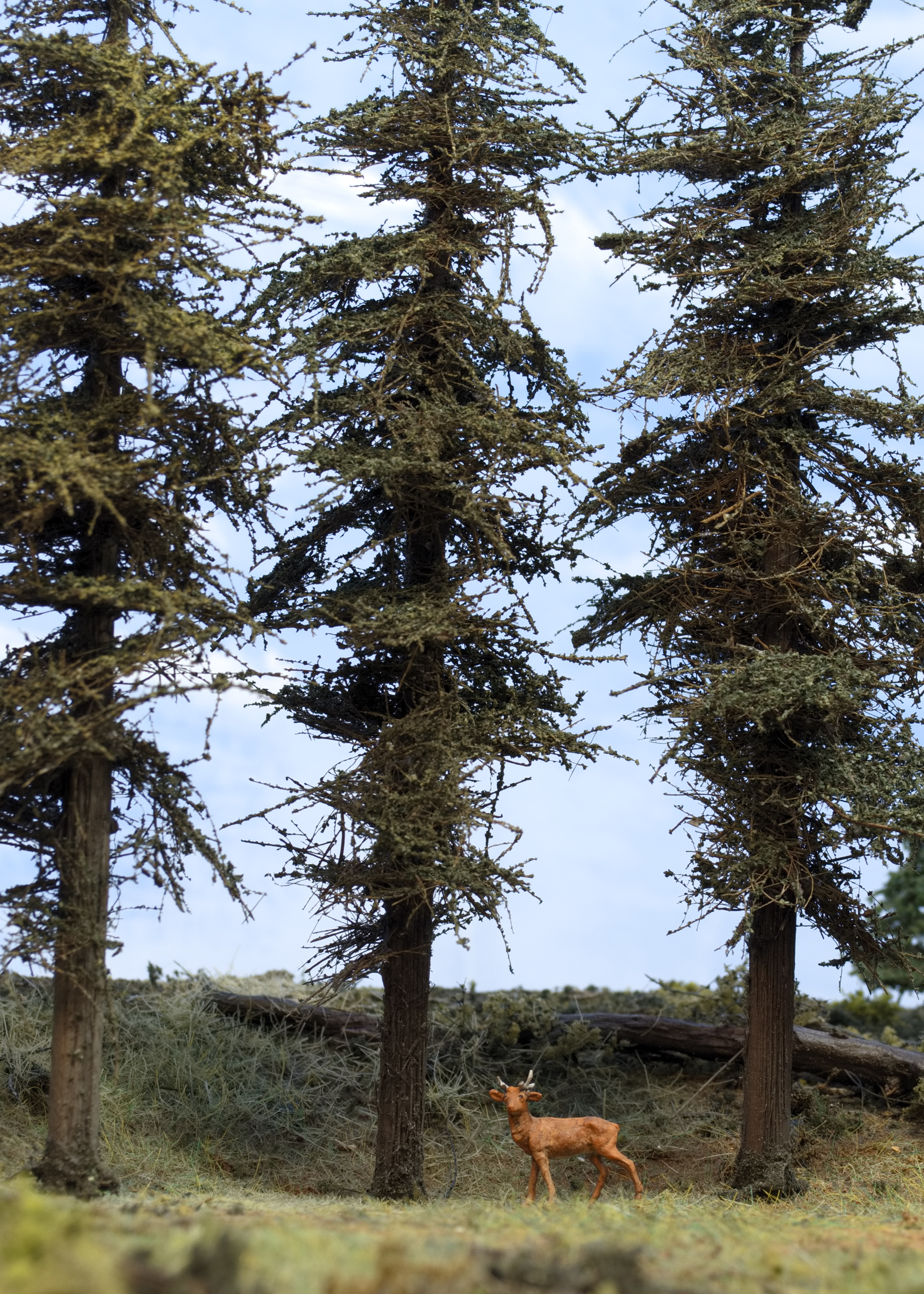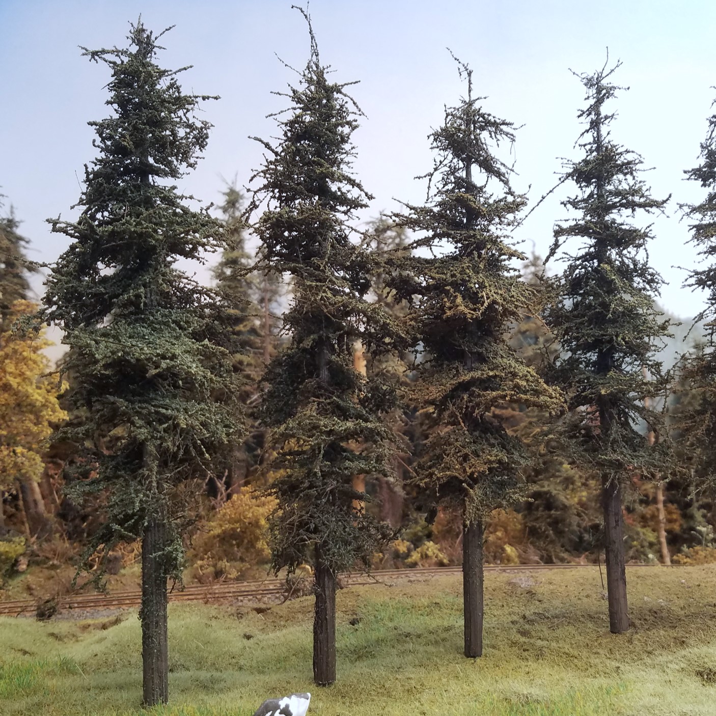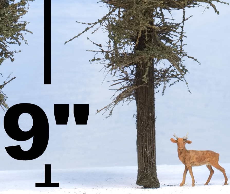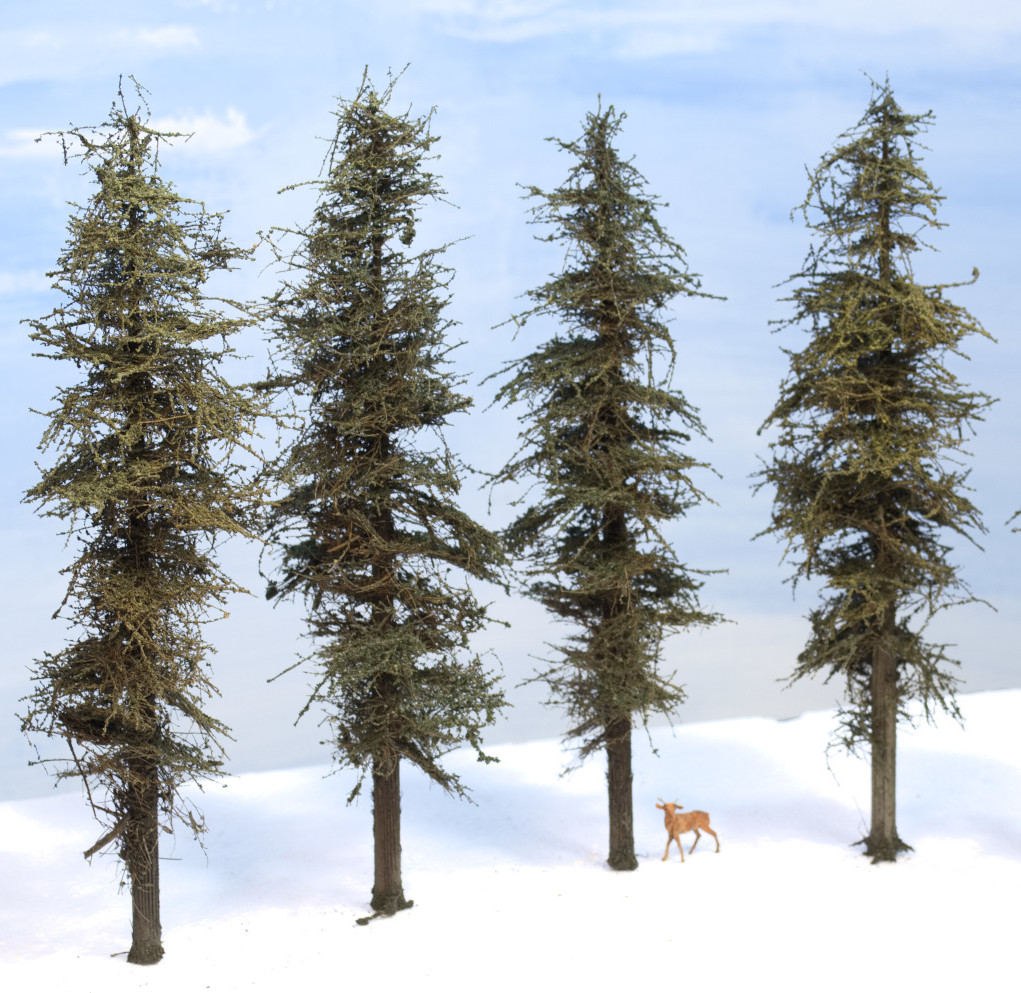 STANDARD Fir Trees, 9 Inch height, Four per box. Every tree is individually handmade with tapered Port Orford Cedar trunks and our green branches foliage build. Includes foliage highlights, and a light dead-needle effect on the undersides and edges. Comes with stainless steel "planting pin" imbedded in the trunk base. Made in Oregon, USA. If not in stock, ships in 1-4 days.