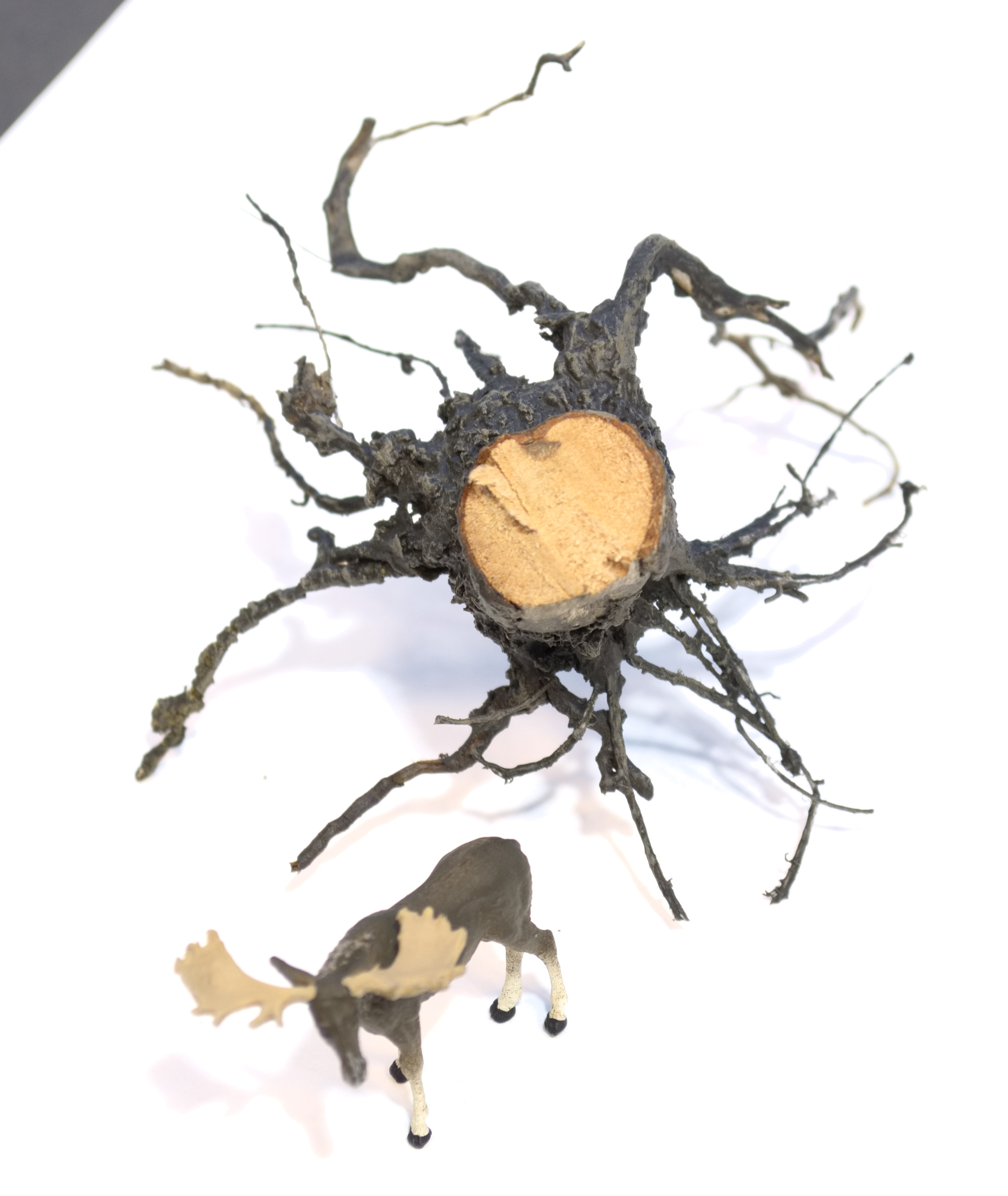 Three handmade stumps with a fresh chainsaw cut of 1/2" diameter. Wedge-cut the same way loggers do it. Features bark & root system details, mosses, and a touch of lichen. Made from real wood, other natural materials, and acrylics.