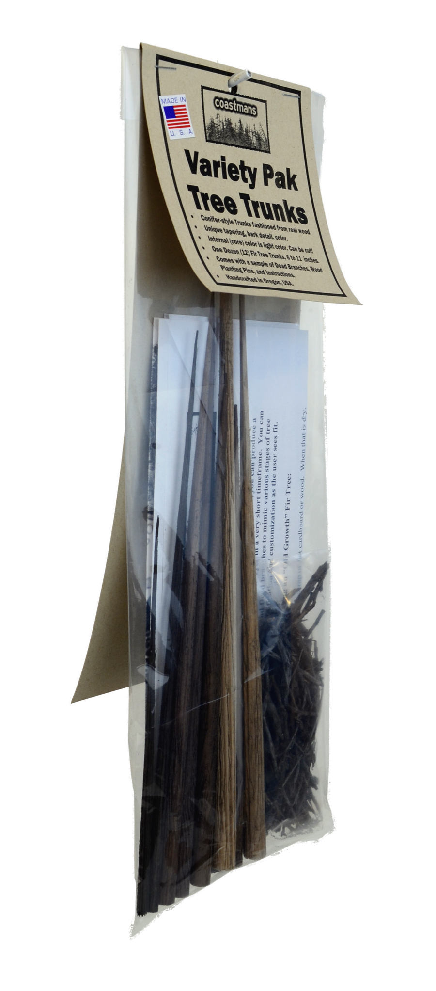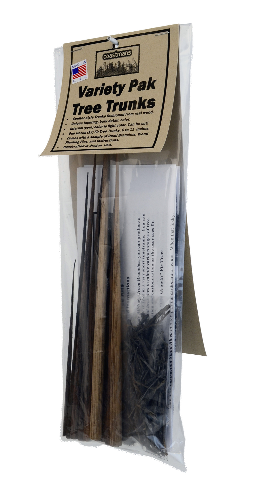 Variety Pak Trunks include a mix of different heights from 6 to 11 inches. All feature our special bark detail and coloring from water-based dyes. They have a light natural wood color on the inside. Base hole is drilled in the bottom already for planting. Comes with a package of dead branches and wooden planting pins. One dozen in a pack. Please note, this item does not come with foliage for making complete trees.