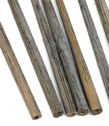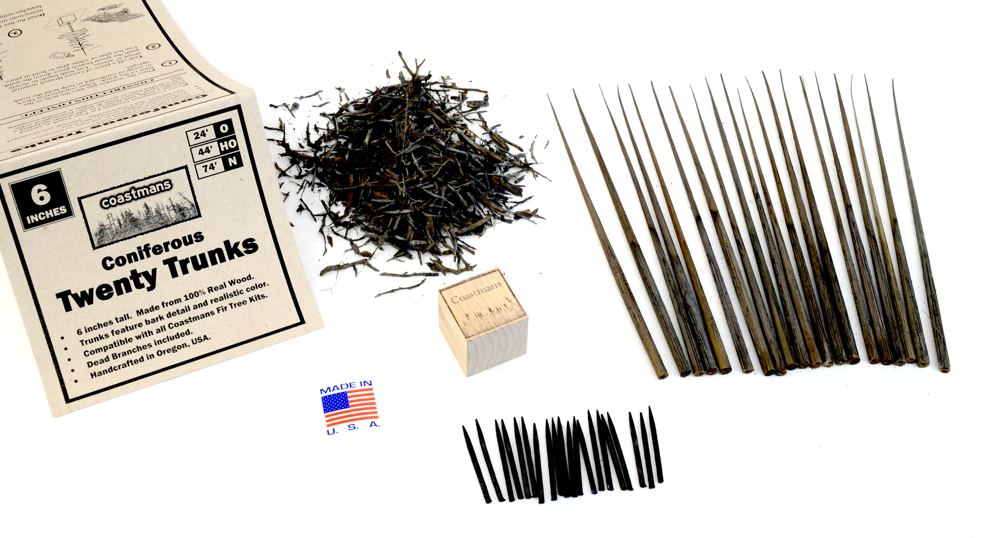 Tapered Bamboo fir Tree Trunks feature what I call a "Second Growth" appearance: A thinner base (3/16" or less), made from bamboo material that is stronger than cedar, good for this size tree. Height 6 inches +/- ½”. 20 trunks per package. Water-based dyes used for coloring, with lighter internal color. Comes with dead branches, mounting pins, and instructions. Please note, this item does not come with foliage for making complete trees.